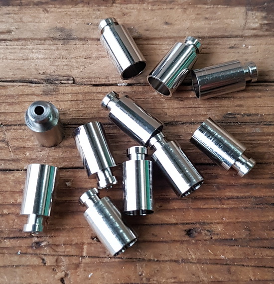 Abschlußhülse / Endkappe, D=5.5/3,5 mm abgesetzt, 5,0 mm innen, L=16,5mm, Bohrung 2.0mm, Messing vernickelt