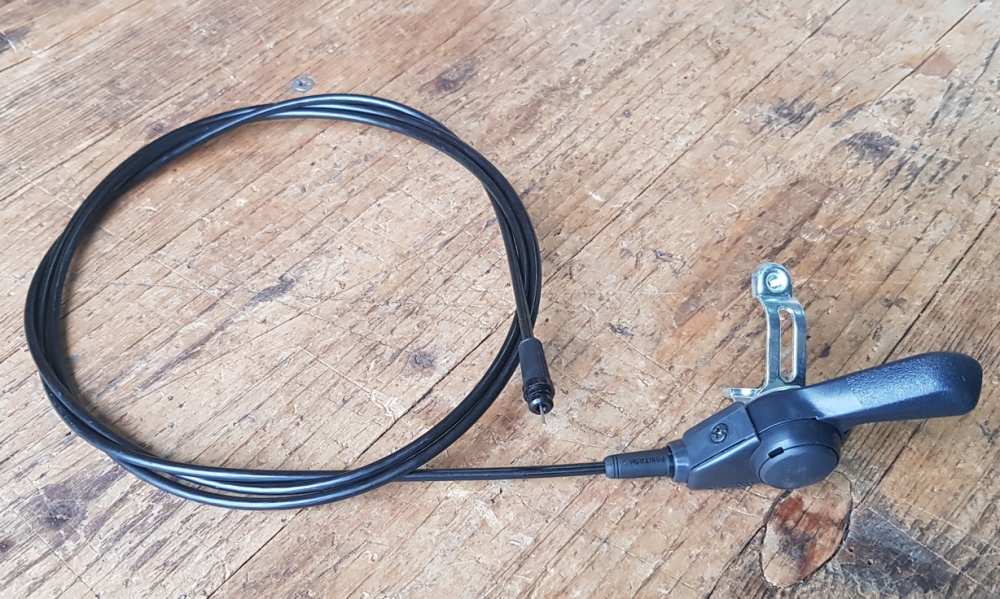 Schalthebel "SHIMANO Positron" SLP 300, 6-Gang, Lenkermontage, Kunststoff schwarz, orig. 80/90er Jahre, incl. Zug mit Aussenlänge ca. 1750mm. Passend für alle Positron 6 Gang Schaltwerke !