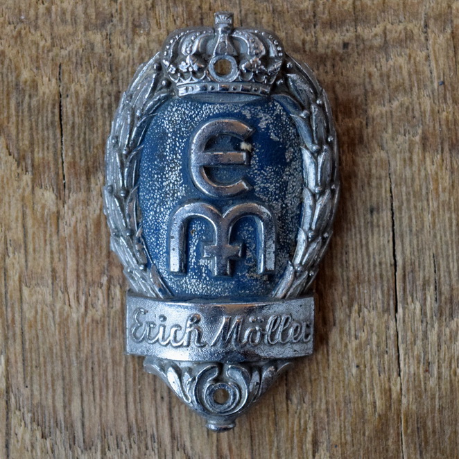 Steuerkopfschild EM ERICH MÖLLER, 50er Jahre, Originalschild aus Sammlungsbestand, Lochabstand 50 mm Ideal für den passenden Fahrradoldtimer oder die Sammlervitrine. Zustand siehe Bild. Übrigens: Wir haben noch eine Riesenmenge weiterer Steuerkopfschilder und Schutzblechembleme im Bestand, die wir niemals alle listen können. Fragt einfach an, wenn Ihr auf der Suche nach einem speziellen Schild oder Emblem seid, vielleicht können wir helfen.