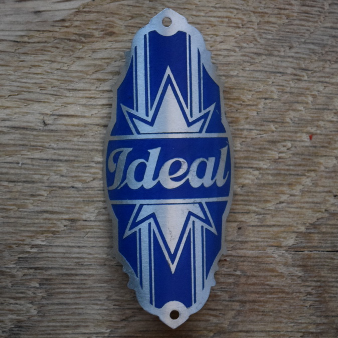 Steuerkopfschild IDEAL, 50er Jahre, Originalschild aus Sammlungsbestand, Lochabstand 73 mm Ideal für den passenden Fahrradoldtimer oder die Sammlervitrine. Zustand siehe Bild. Übrigens: Wir haben noch eine Riesenmenge weiterer Steuerkopfschilder und Schutzblechembleme im Bestand, die wir niemals alle listen können. Fragt einfach an, wenn Ihr auf der Suche nach einem speziellen Schild oder Emblem seid, vielleicht können wir helfen.