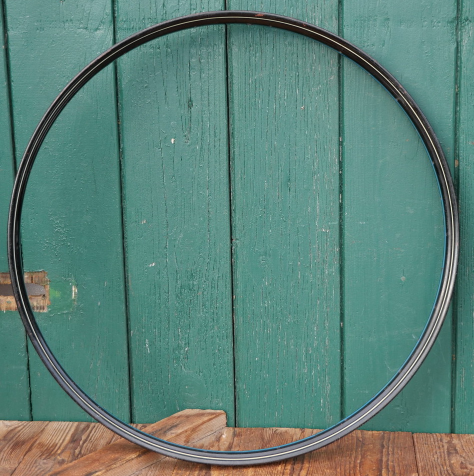 Felge, 26 Zoll (559), Stahl schwarz, Linierung weiß/blau, 30er-50er J., 36-loch, Breite ca. 35mm, alte Neuware mit leichten Lagerungsspuren, Zustand gemäß Fotos