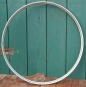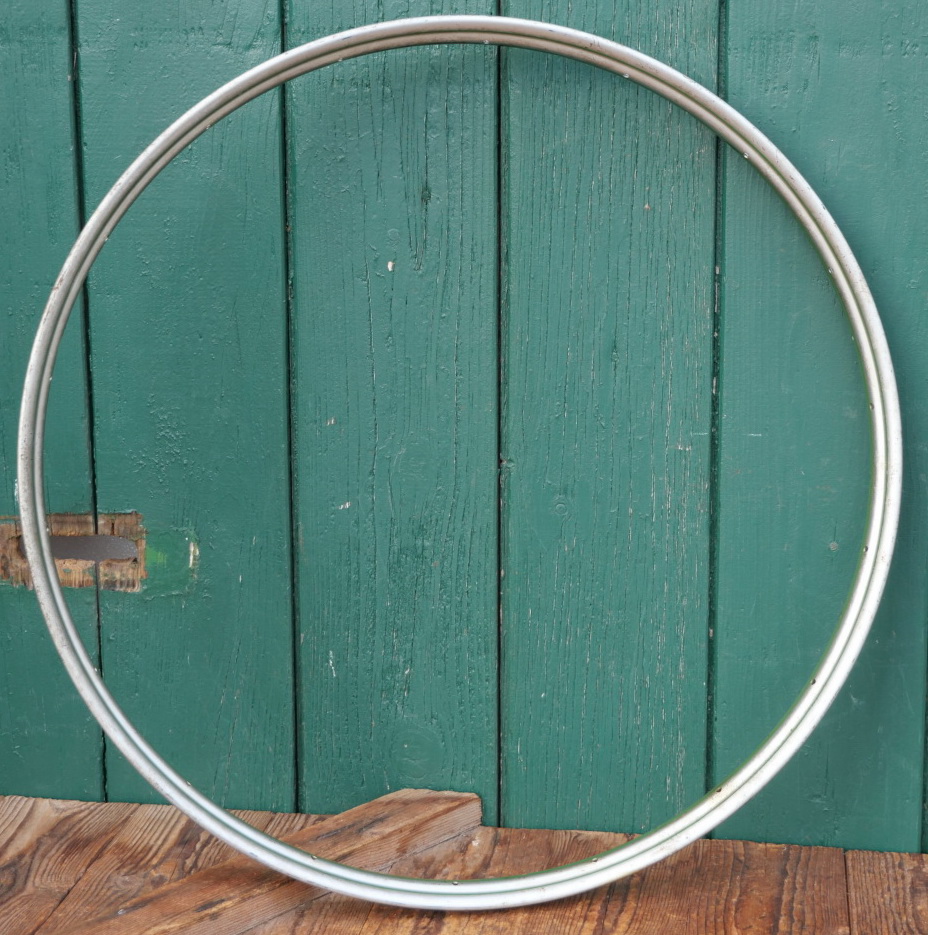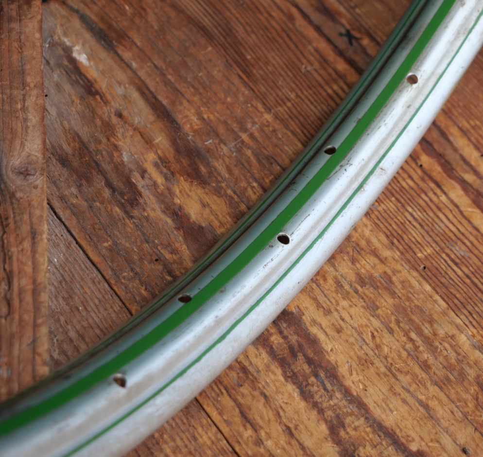 Felge, 26 Zoll (559), Stahl silber lackiert, Linierung grün, 50er J., 36-loch, Breite ca. 35mm, alte Neuware mit leichten Lagerungsspuren, Zustand gemäß Fotos