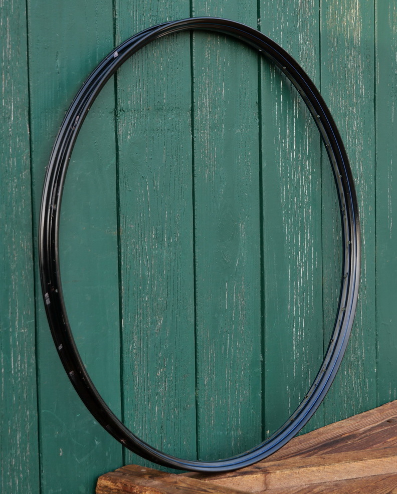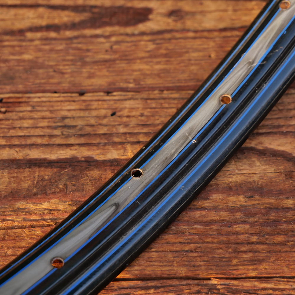 Felge, 28 Zoll (622), schwarz, Linien blau/Mitte weiß geflammt, für WANDERER, 30er-50er J., 36-Loch, gebohrt für 2mm Speichen, Breite ca. 34 mm, alte Neuware mit leichter Lagerpatina, Zustand gemäß Fotos