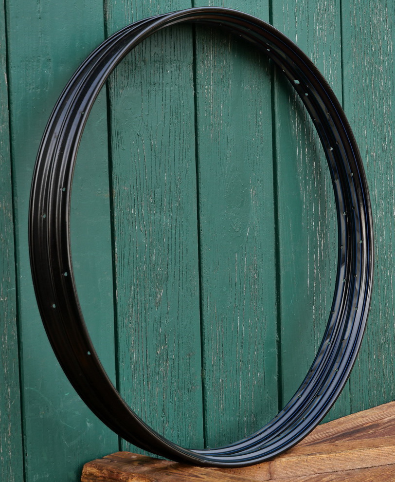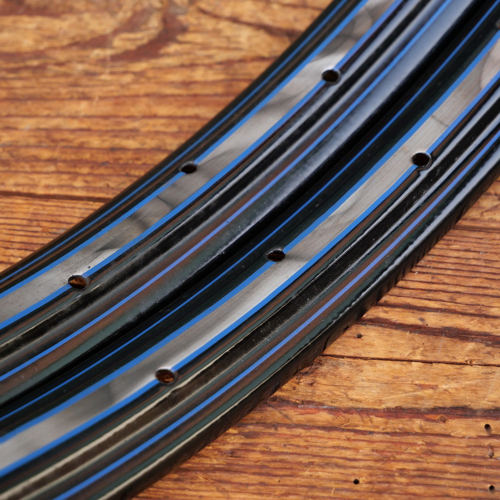 Felgensatz, 26 Zoll (559), schwarz, Linien blau, Mitte weiß geflammt, für WANDERER Ballonrad, 30er J., 36-Loch, gebohrt für 2mm Speichen, Breite ca. 37 mm, alte Neuware in Top-Zustand gemäß Fotos