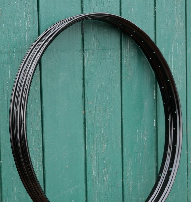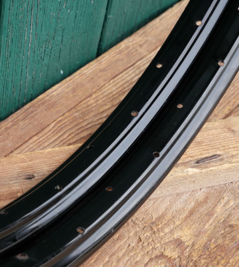 Felgensatz, 28 Zoll (622), Stahl schwarz lackiert, 30er/40er J., 36 Loch, gebohrt für 2mm Speichen, Breite ca. 35mm, alte Neuware mit partieller Lagerpatina, Zustand gemäß Fotos