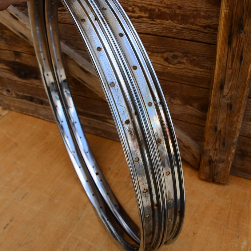 Kastenfelgenpaar für Drahtbereifung "Schürmann" 24 Zoll, (22-507) verchromt, Breite 30 mm, 36-Loch, NOS mit leichter Patina