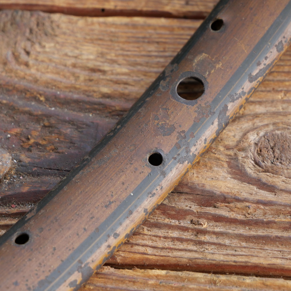 Wulstfelge 26 Zoll, Außendurchmesser ca. 594 mm, 20er/30er Jahre, seltene, schmale Ausführung für Halbrenner, Breite ca. 31 mm, 36 Loch, Holzdekor, Linien schwarz/gold, gebraucht mit Patina, Substanz gut, Zustand gemäß Fotos