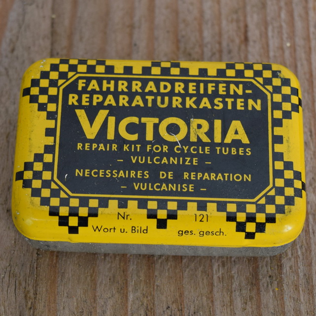 Flickzeug Blechdose "VICTORIA" orig. 50 er Jahre, 59 x 40 x 16 mm, ohne Inhalt Zur authentischen Füllung haben wir noch altes Flickmaterial zum zuschneiden und orig. alte Continental Gummilösung im SHOP. Zum Gebrauch auch frische Ware in unseren TIPTOP Sets, ArtNr. 04656.