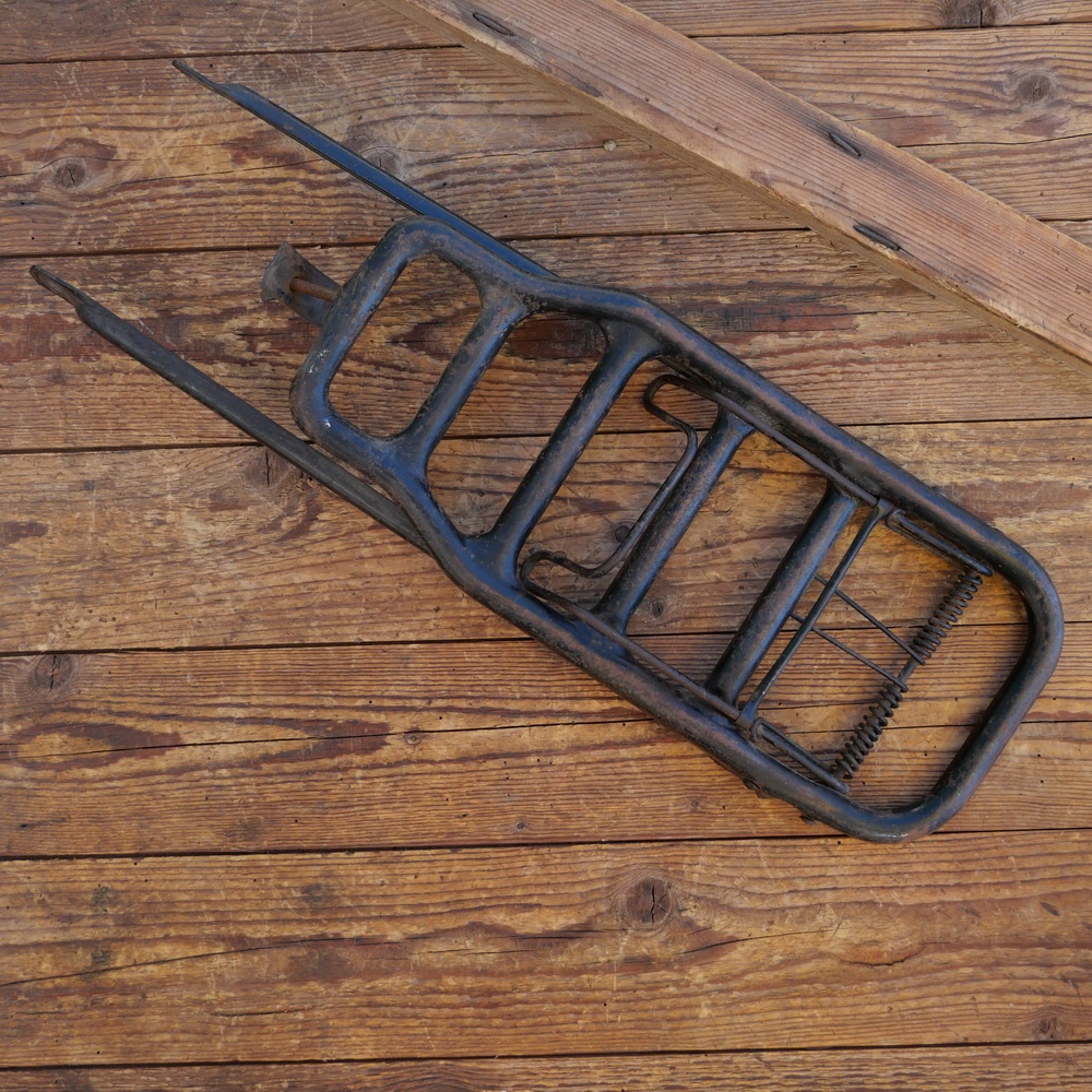 Gepäckträger, orig. 30er-50er Jahre, schwarz, Profilblech, Montage oben an den Sattelstreben, Montage unten auf der Achse, Ladefläche ca. 33 x 17 cm, Strebenlänge ca. 44 cm für 28 Zoll, gebraucht, Zustand gemäß Fotos