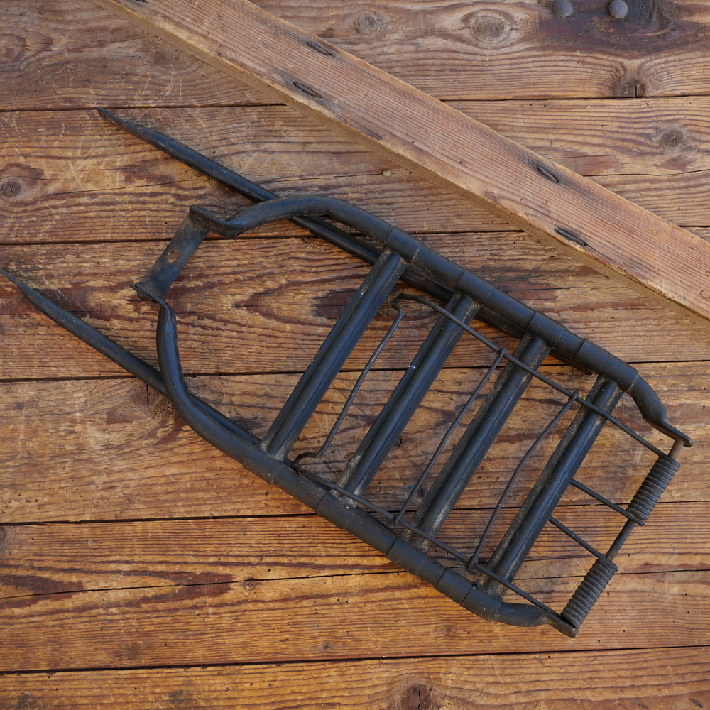 Gepäckträger, orig. 30er Jahre, schwarz, schwere, breite Ausf., Montage oben an den Sattelstreben, Montage unten auf der Achse, Ladefläche ca. 30 x 20 cm, Strebenlänge ca. 40 cm für 26 Zoll, gebraucht mit Patina, Zustand gemäß Fotos
