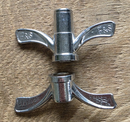 Flügelmutternsatz f. Dreigangnabe F&S Mod 55, 60-70er Jahre Mod. 415/515 und 80er Jahre Modelle , orig. NOS. Sehr hochwertige Ausführung, verchromt , 2 x Hinterrad (Kettenleitmutter F&S gemarkt)
