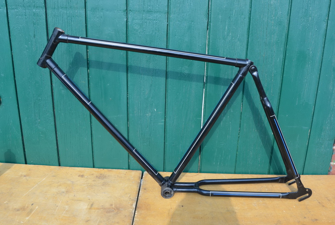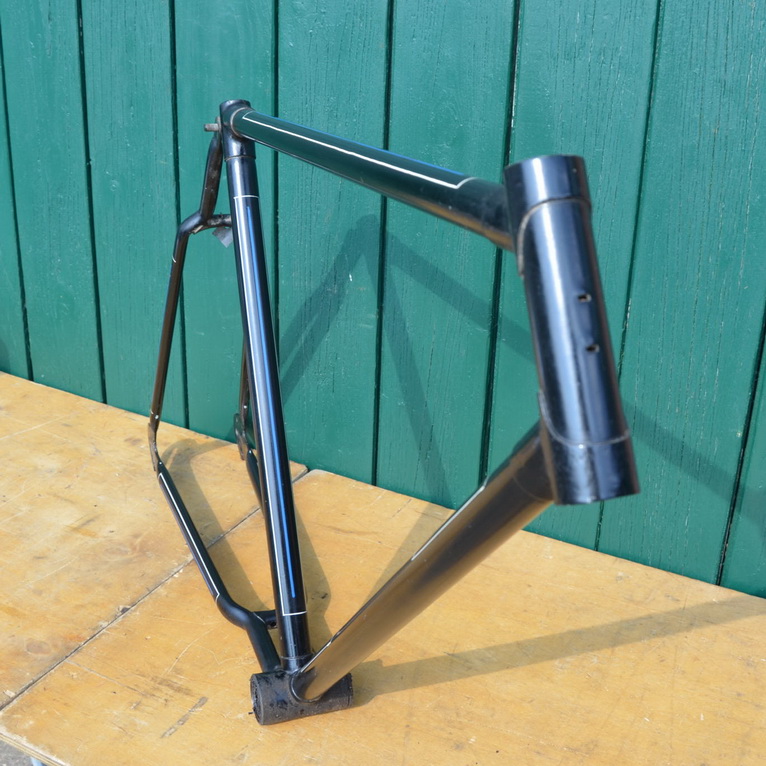 Fahrradrahmen "Adler", 50er Jahre, Linierung blau/weiß, Herrenausführung, 28 Zoll, Rahmenhöhe 55 cm, Rahmennummer 354XXX. Dieser Rahmen wurde von Jahrzehnten abgestrahlt, neu lackiert, handliniert aber nie aufgebaut. Ein paar lagerungsbedingte, kleine Kratzer können vorhanden sein. Ansonsten aber eine unschlagbar günstige Möglichkeit, einen bereits aufgearbeiteten, frühen Rahmen zu neuem Leben zu erwecken!