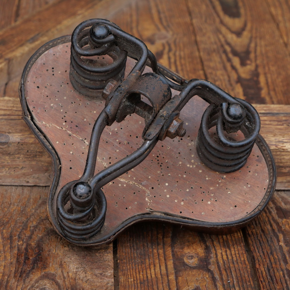 Sattel, Unisex, ANKER, Gesundheitssattel, Leder gepolstert, braun, Unterbau Holz, Gestell lackiert, Niederlande 30er-50er J., Breite ca. 22 cm, Länge ca. 17 cm, gebraucht, Holz wurmstichig, für museale Zwecke, Zustand gemäß Bildern