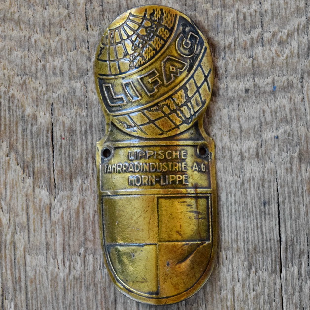 Steuerkopfschild LIFAG, 20er Jahre, Originalschild aus Sammlungsbestand, Lochabstand 22 mm Ideal für den passenden Fahrradoldtimer oder die Sammlervitrine. Zustand siehe Bild. Übrigens: Wir haben noch eine Riesenmenge weiterer Steuerkopfschilder und Schutzblechembleme im Bestand, die wir niemals alle listen können. Fragt einfach an, wenn Ihr auf der Suche nach einem speziellen Schild oder Emblem seid, vielleicht können wir helfen.