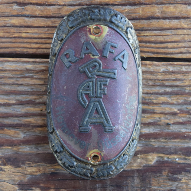 Steuerkopfschild RAFA, 50er Jahre, Originalschild aus Sammlungsbestand, Lochabstand 48 mm Ideal für den passenden Fahrradoldtimer oder die Sammlervitrine. Zustand siehe Bild. Übrigens: Wir haben noch eine Riesenmenge weiterer Steuerkopfschilder und Schutzblechembleme im Bestand, die wir niemals alle listen können. Fragt einfach an, wenn Ihr auf der Suche nach einem speziellen Schild oder Emblem seid, vielleicht können wir helfen.