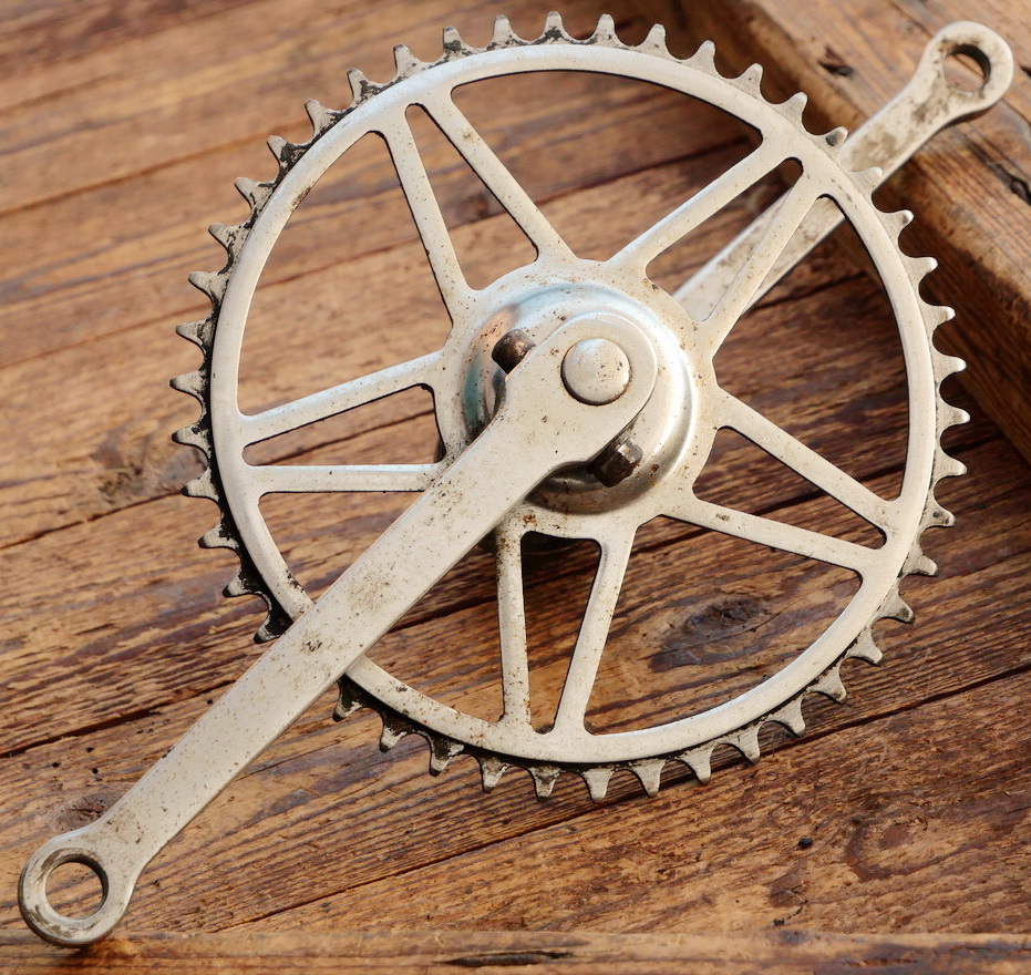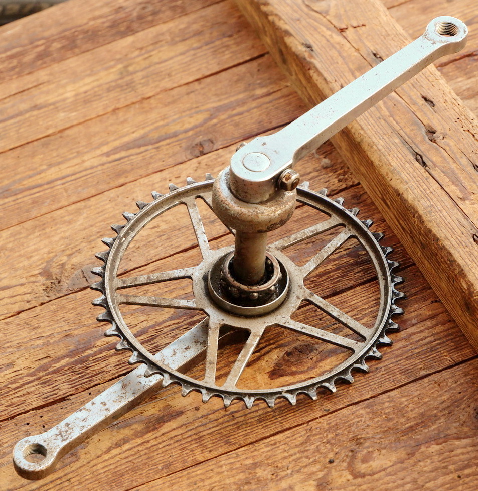 Tretlager für Tourenrad, orig. 50er/60er J., verchromt, Glocken-Keillager, Kettenblatt 46 Zähne, Kurbellänge 170 mm, ohne Lagerschalen, gebraucht mit Patina, Lager o.k, Zustand siehe Bilder.