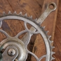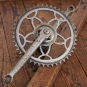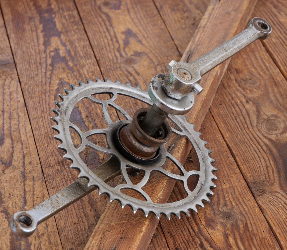 Tretlager universal für Tourenrad, orig. 30er-50er Jahre, verchromt, Glocken-Keillager, Kettenblatt 46 Zähne, Kurbellänge 170 mm, Durchmesser Lagerschalen 40 mm, gebraucht mit Patina, Zustand siehe Bilder. Rares Originalteil für den passenden Klassiker! Hinweis zum Zustand: Die Tretlager sind unrestauriert,in der Substanz aber ok. Optik und Zustand der Zähne, siehe Bilder. Die Konen und Lager müssen,soweit überhaupt dabei und je nach Anspruch an den technischen Zustand, ggf. überholt/ergänzt oder ausgetauscht werden. Ersatzteile können wir für viele Typen gegen Berechnung liefern.
