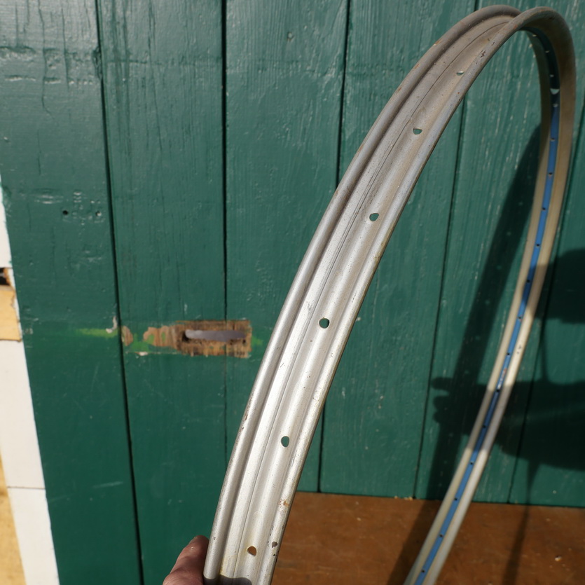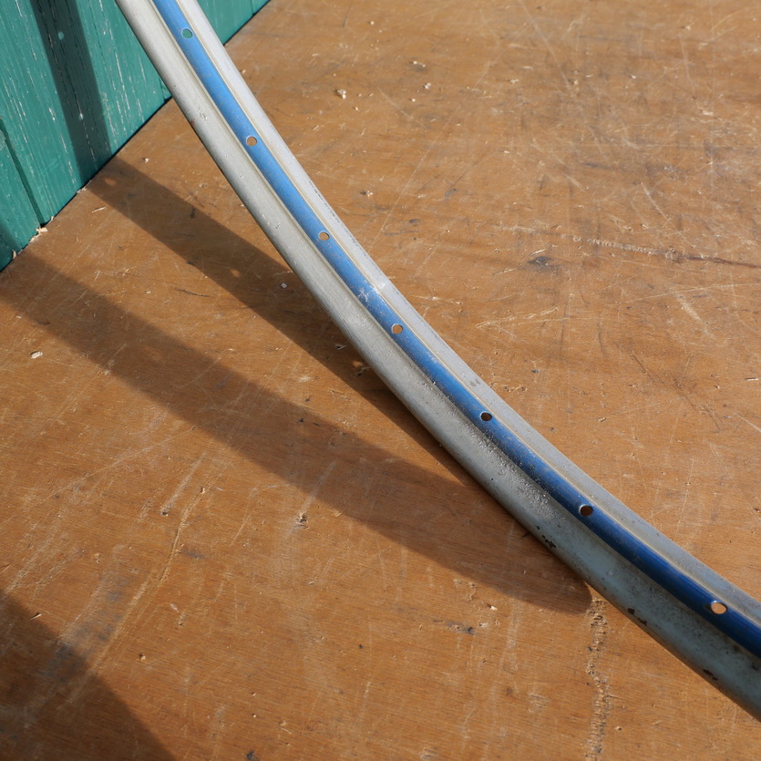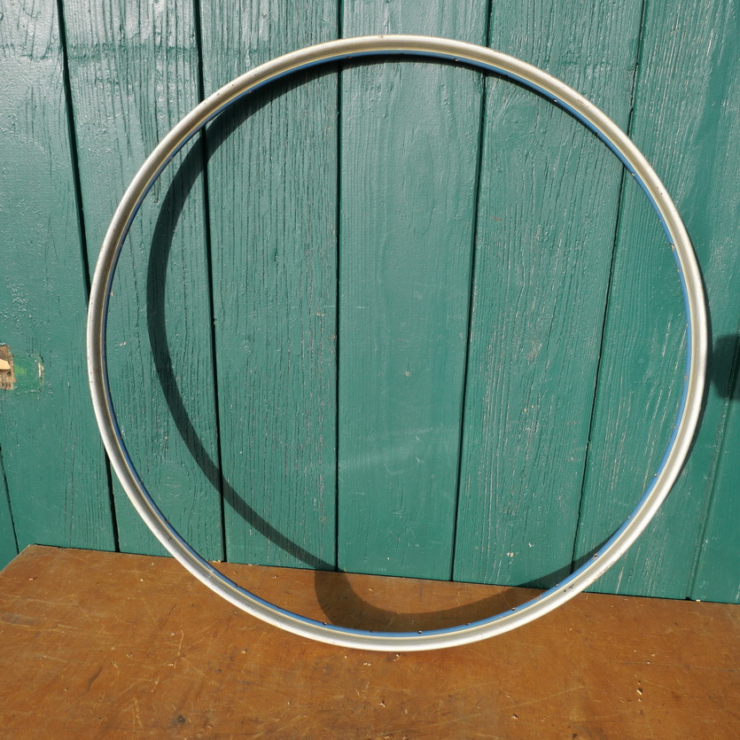 Fahrradfelge (Westwood) für Drahtbereifung 28 Zoll (622), schmale Ausführung m. Breite 32 mm, silber, Linierung blau-weiß, 36-loch, NOS, alte Lagerware, ggf. leichte Patina, s. Bilder