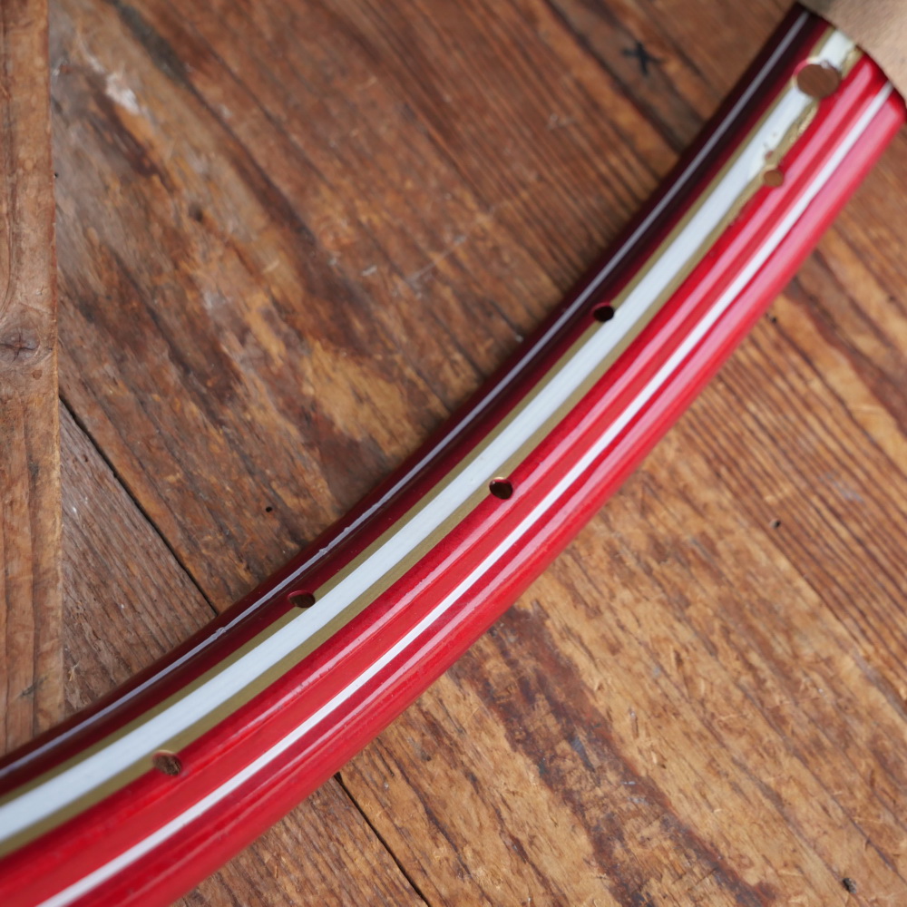 Felge, 26 Zoll (559), Stahl rot-metallic, Linierung weiß/gold, 50er J., NOS