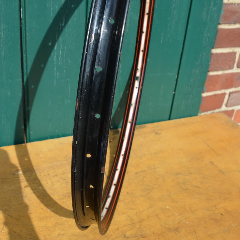 Felge 26 x 1,75, für Drahtbereifung, 36-loch, schwarz, Linierung rot/weiß, passend gebohrt für 2mm-Speichen