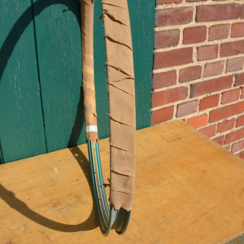 Felge 28 x 1,75 für Drahtbereifung, 36-loch, Breite 35 mm, grün metallic, gold/weiß liniert, NOS, Passend gebohrt für 2mm-Speichen