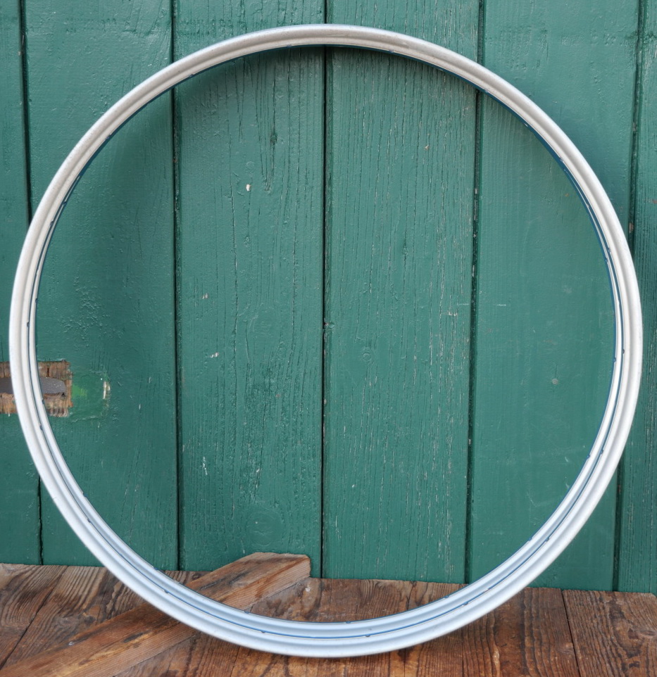 Felgensatz, 26 Zoll (559), Stahl silber lackiert/Linierung blau/weiß, 50er J., 36-loch, gebohrt für 2mm Speichen, Breite ca. 35mm, alte Neuware mit leichten Lagerungsspuren, Zustand gemäß Fotos