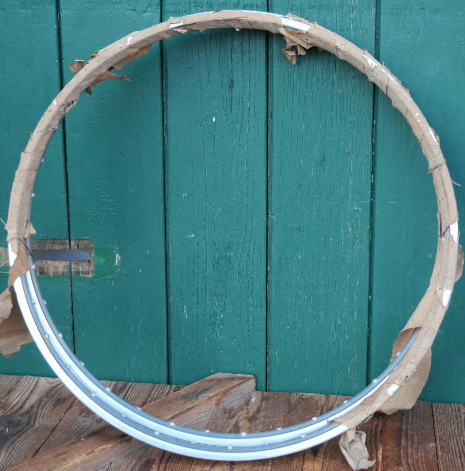 Moped-Felgensatz, 26 Zoll (559), für Drahtbereifung, Alu poliert, 50er/60er J., 36-Loch, Breite ca. 35mm, alte Neuware in Originalverpackung mit minimaler Patina, Zustand gemäß Fotos
