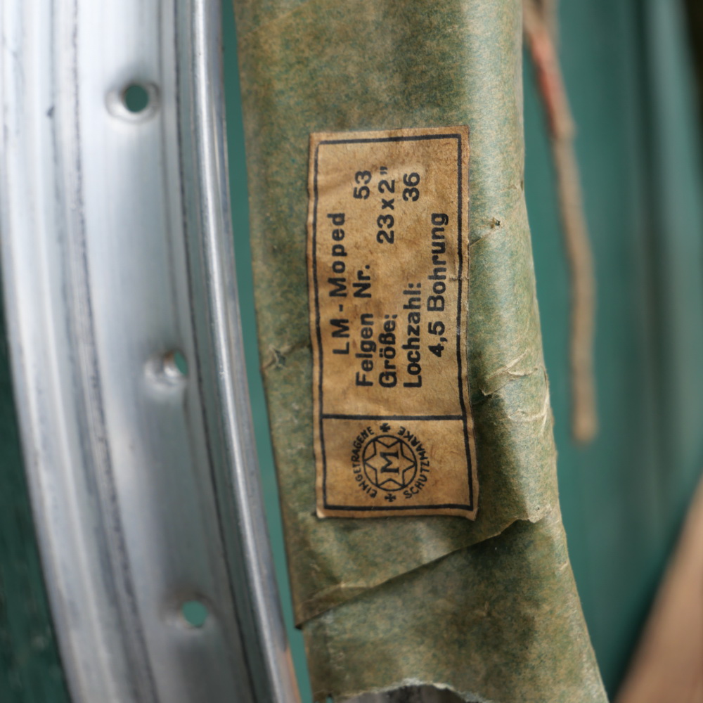 Mopedfelgen-Satz MAYWEG #53, 23 x 2.00/2-19, 50er J., Alu poliert, Breite 37 mm, 36 Loch, Bohrungen 4,5 mm, alte Neuware in Originalverpackung mit leichter Lagerpatina, Zustand gemäß Fotos.