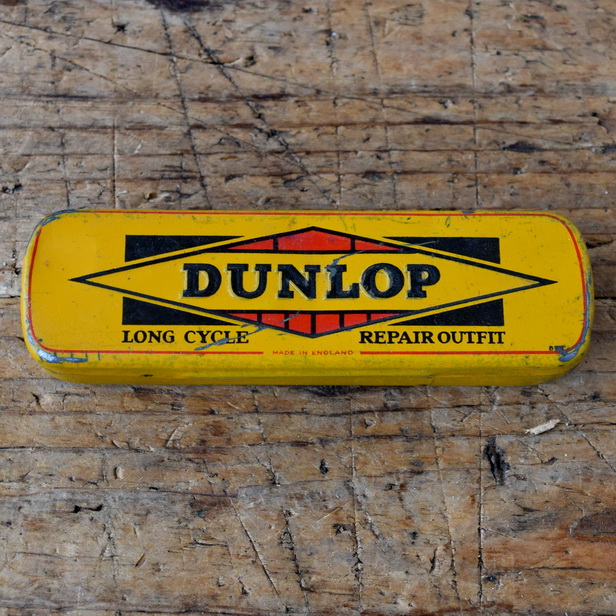 Flickzeug Blechdose "DUNLOP" orig. 50er Jahre, 116 x 34 x 17 mm, ohne Inhalt Zur authentischen Füllung haben wir noch altes Flickmaterial zum zuschneiden und orig. alte Continental Gummilösung im SHOP. Zum Gebrauch auch frische Ware in unseren TIPTOP Sets, ArtNr. 04656.
