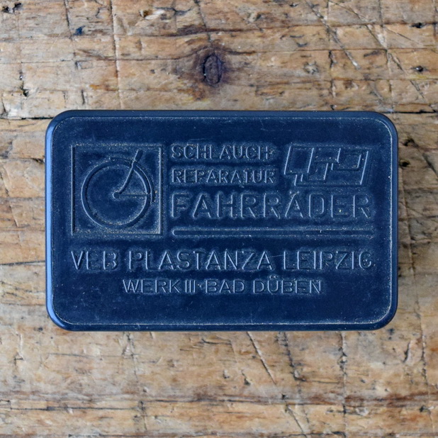 Flickzeug Kunststoffdose "VEB PLASTANZA LEIPZIG" orig. 70er Jahre, 76 x 48 x 20 mm, ohne Inhalt Zur authentischen Füllung haben wir noch altes Flickmaterial zum zuschneiden und orig. alte Continental Gummilösung im SHOP. Zum Gebrauch auch frische Ware in unseren TIPTOP Sets, ArtNr. 04656.