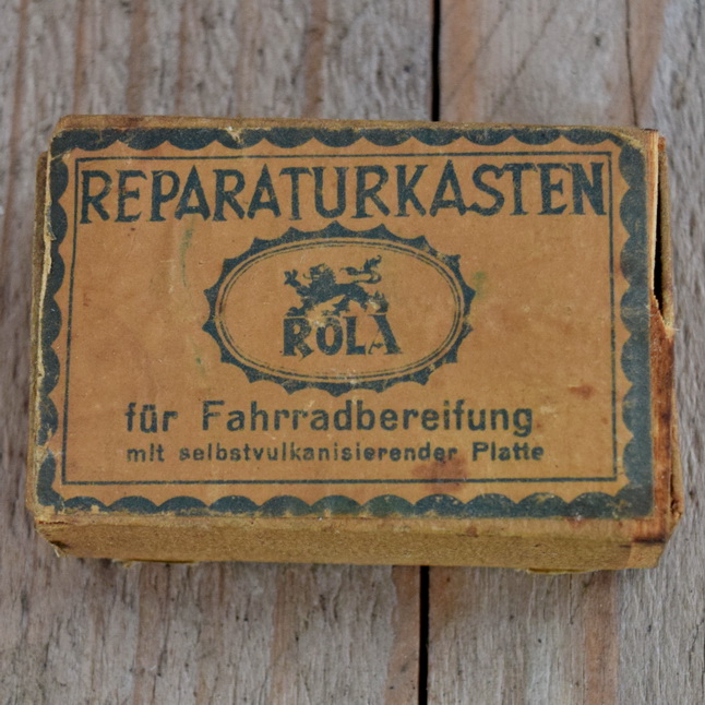 Flickzeug Pappschachtel "ROLA" orig. 30 er Jahre, 58 x 38 x 18 mm, ohne Inhalt Zur authentischen Füllung haben wir noch altes Flickmaterial zum zuschneiden und orig. alte Continental Gummilösung im SHOP. Zum Gebrauch auch frische Ware in unseren TIPTOP Sets, ArtNr. 04656.