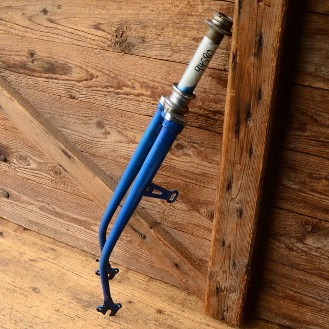 Gabel 28 Zoll, blau metallic, Schaftlänge 390 mm, Weite oben 47 mm, 70/80er Jahre. Zustand siehe Bilder.