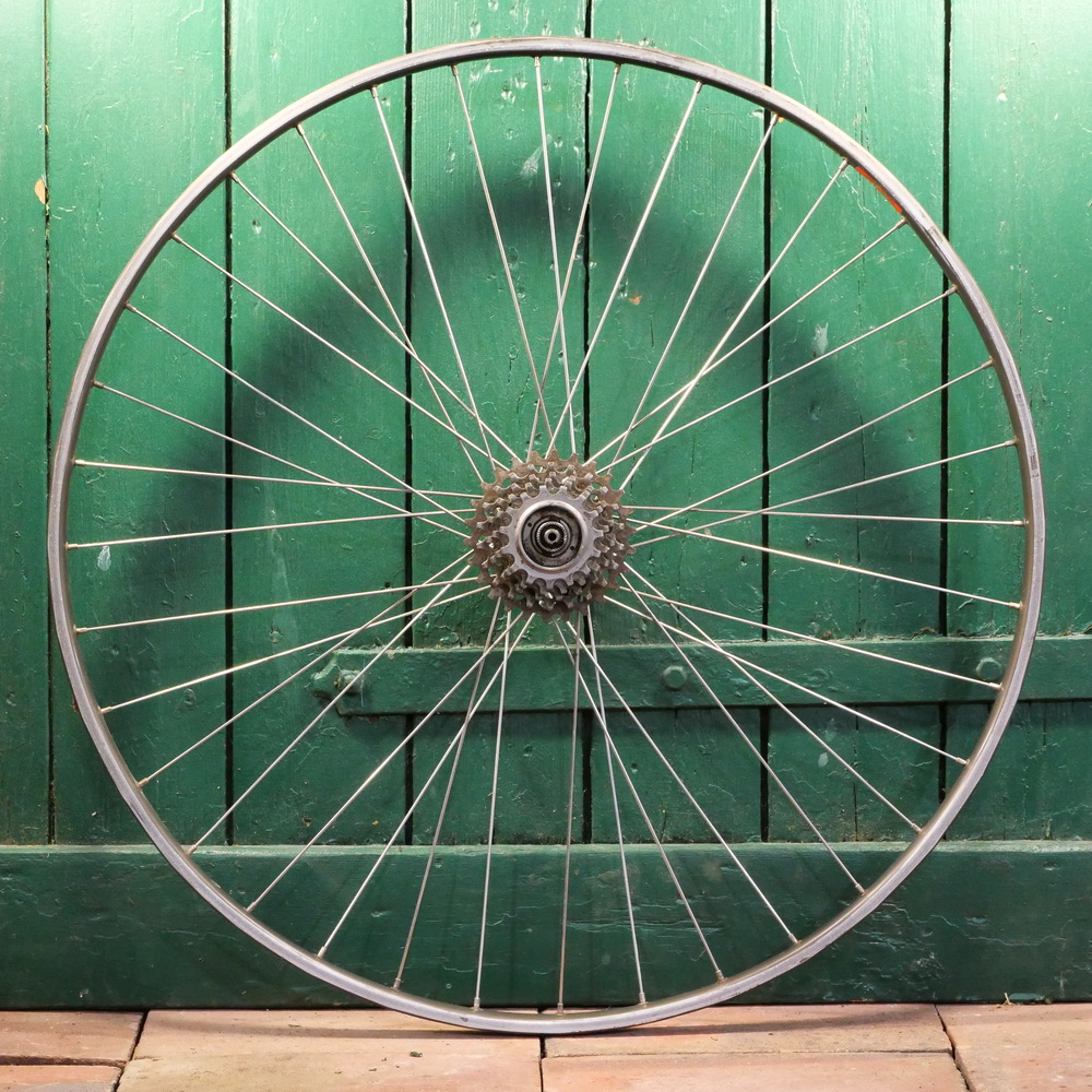 Hinterrad, 27 Zoll (630), 70er/80er J., MAVIC GP4 Schlauchreifen-Felge, Alu braun eloxiert, für Rennrad, Breite 20mm, 2mm Speichen Niro, CAMPAGNOLO Record-Nabe mit REGINA Extra Schraubkranz 5-fach/15-26 Zähne, Einbaumaß 126mm, gebraucht mit Patina, Zustand gemäß Fotos