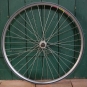 Vorderrad, 26 Zoll (559mm), 90er J., RIGIDA Turbo 9 Alu-Felge mit Keramikbeschichtung, für Drahtreifen, silbergrau eloxiert, Breite 22mm, 2mm Speichen verzinkt, SHIMANO STX-Nabe mit Schnellspanner, Einbaumaß 100mm, alte Neuware mit leichter Patinma, Zustand gemäß Fotos