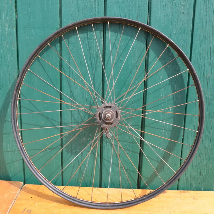 Laufrad hinten 28 x 1,75 schwarz, Linierung weiß/rot, Breite 36 mm, Ventilbohrung 8,5 mm, Einbaumaß 110 mm, Modell von 1953 mit deutlichen Gebrauchsspuren