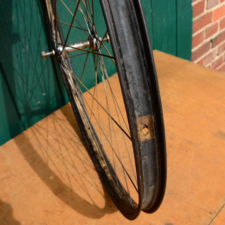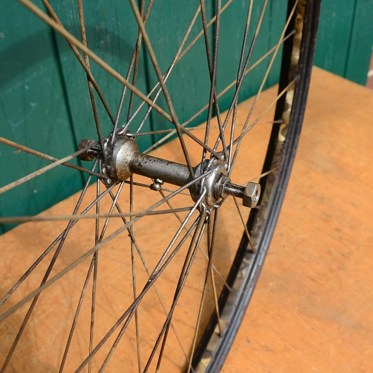 Laufrad vorn "Miele" 28 x 1,75, Speichen patiniert, Felgenbreite 37 mm, Linierung gold/weiß geflammt, 30er Jahre, Miele-Schreibschrift gemarkte Nabe