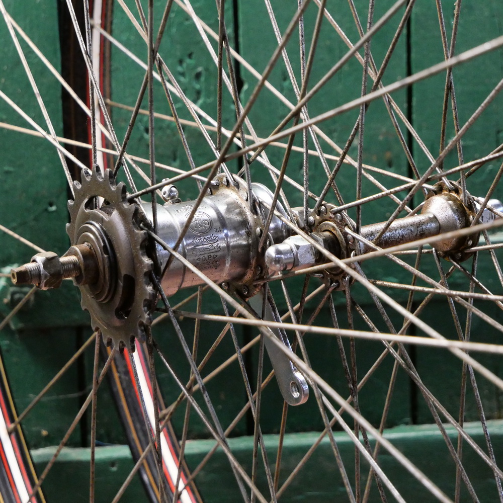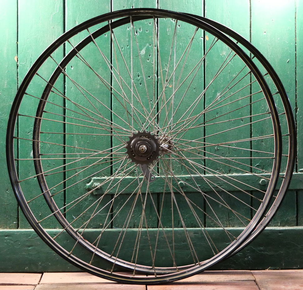 Laufradsatz 28 x 1,75 (622) für Drahtbereifung, um 1960, Felgenbreite ca. 35 mm, schwarz, Linierung weiß/rot/gold, passend für späte NSU, Speichen 2mm verchromt, Naben: vorn verchromt / hinten "F&S Torpedo" mit Steckritzel 20 Zähne, Einbaumaß ca. 91/108 mm, schöne Patina, mit Gebrauchsspuren