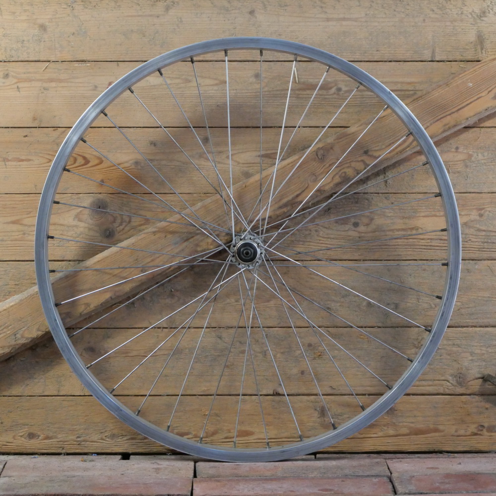 Vorderrad mit ARAYA Alu-Felge VP 20, 26 Zoll (559), 1990er J., Breite ca. 26 mm, SHIMANO-Nabe mit Schnellspanner, Einbaumaß ca. 100 mm, 2mm Speichen Niro, gebraucht mit Patina, Zustand gemäß Fotos