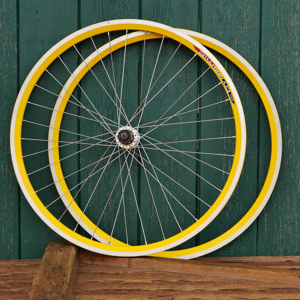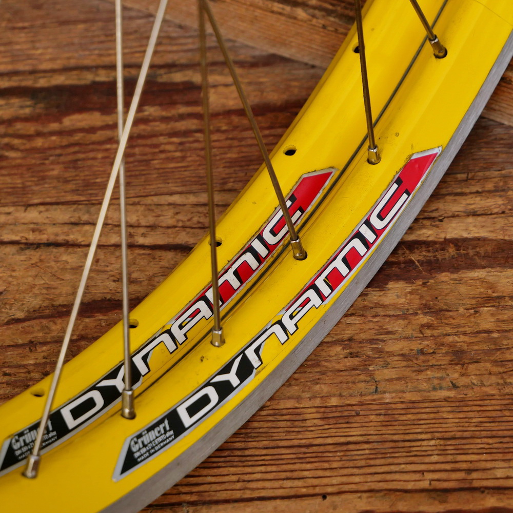 Hinterrad, 26 Zoll (559),mit GRÜNERT Dynamic Hochprofil-Felge, Alu, gelb, für MTB 90er J., Breite 28 mm, 36 Loch, Nabe KEYIN, Alu, für 8-fach Kassette, Einbaumaß ca. 135 mm, 2mm Speichen Niro, inkl. passender Vorderradfelge, alte Neuware mit Lagerungsspuren, Zustand gemäß Fotos
