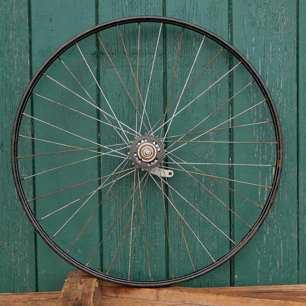 Hinterrad, 26 Zoll, mit Wulst-Felge, schwarz, Linien weiß/blau, 30er-50er J., Breite 32 mm, 36 Loch, Nabe RENAK 1959, verchromt, mit Schraubkranz 20 Zähne, Einbaumaß ca. 108 mm, 2mm Speichen verchromt, gebraucht mit Patina, Lager und Funktion gut, Zustand gemäß Fotos