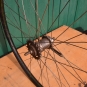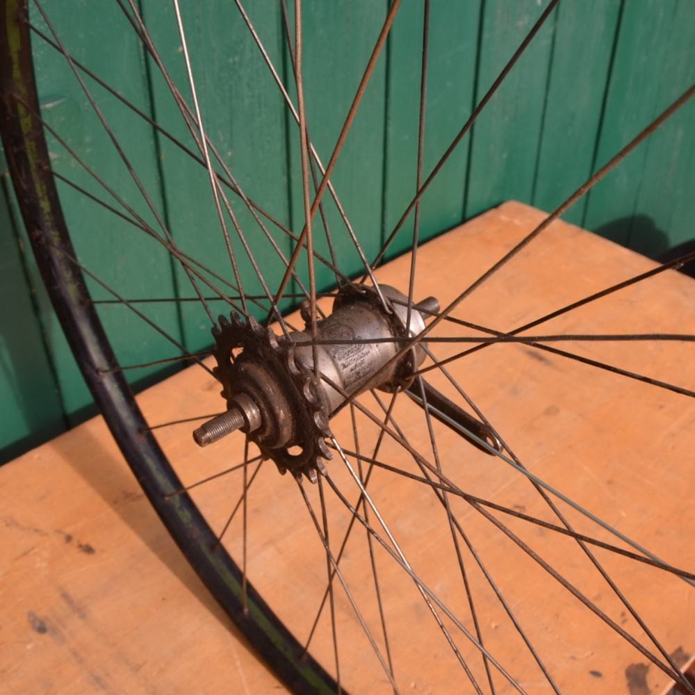 Laufrad hinten mit Wulstfelge 28 x 1,5 Stahl, schwarz, Linierung grün, mit Patina, Sachs Torpedo Nabe von 1930, Breite 31 mm, Einbaumaß 108 mm, Ventilbohrung 8,5 mm