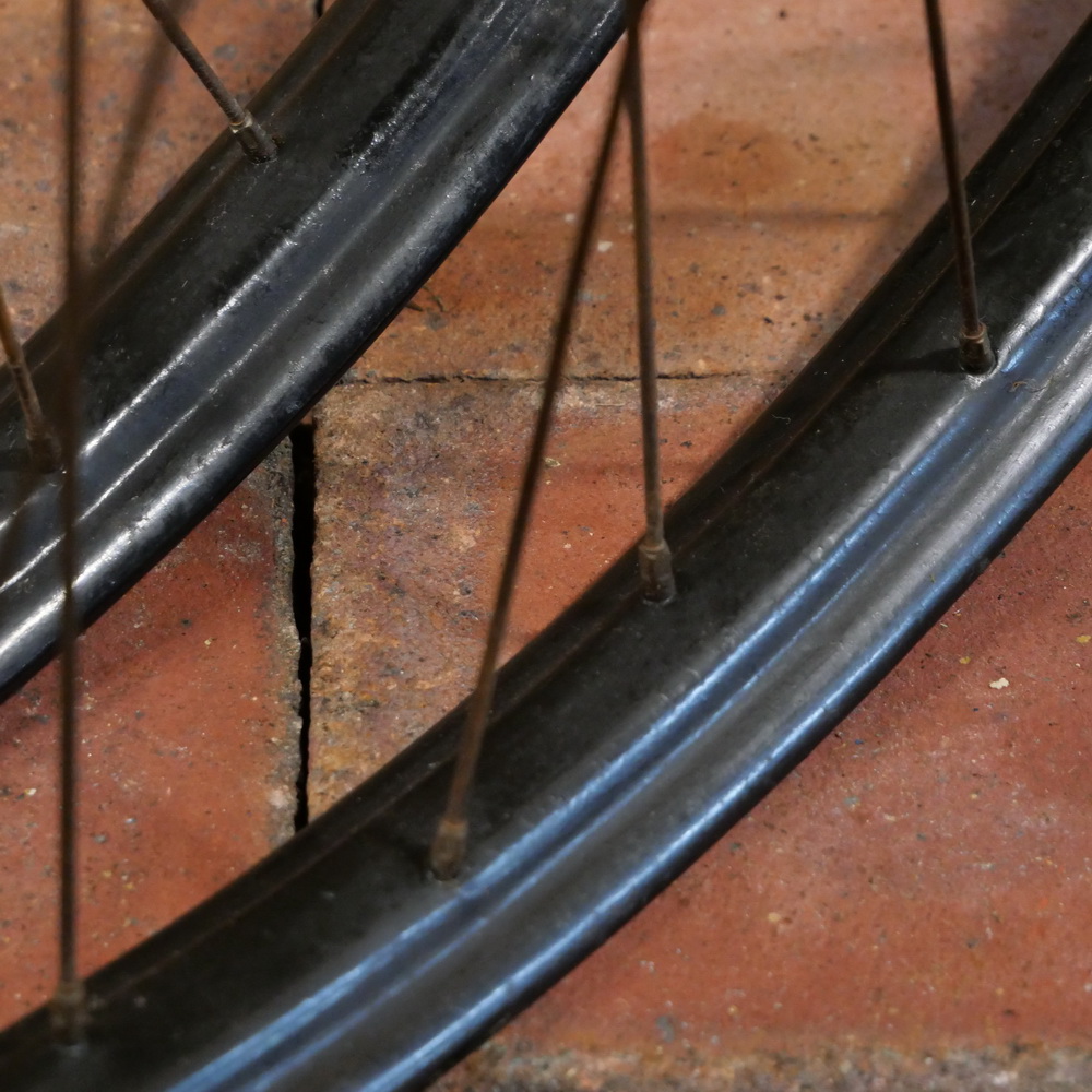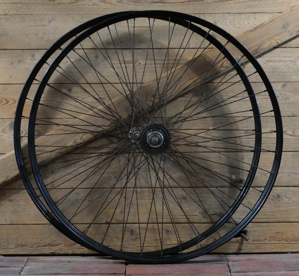 Laufradsatz 28 Zoll (622), für Drahtbereifung, 1938, Felgenbreite ca. 40 mm, schwarz, Einbaumaße ca. 91/108, Naben: ungemarkt verchromt / F&S Torpedo verchromt mit Schraubritzel 21 Zähne, Speichen 2 mm verchromt, gebraucht mit Patina, Felgen überstrichen, Speichen stark patiniert, technisch o.k., Zustand gemäß Fotos