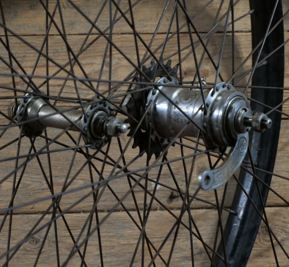 Laufradsatz 28 Zoll (622), für Drahtbereifung, 1938, Naben: ungemarkt verchromt / F&S Torpedo verchromt, gebr.