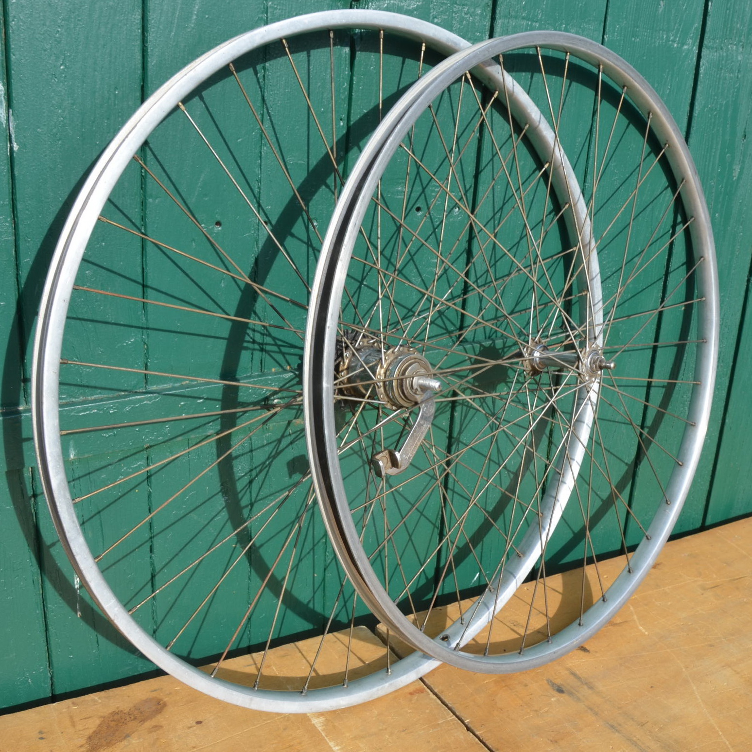 Laufradsatz 28 x 1 5/8, Alu mit F&S Naben von 1950, Breite 27 mm, Einbaumaß 92/110 mm, Ventilbohrung 8,5 mm, gebraucht mit Patina