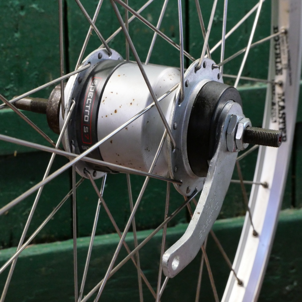 Hinterrad "Schürmann Double Master", Alu, Hohlkammerfelge für Drahtreifen, 26 Zoll (559), Breite ca. 28 mm, Nabe "Sachs Spectro S7", Einbaumaß ca. 130 mm, 2mm Speichen rostfrei, alte Neuware mit Lagerungsspuren gemäß Fotos