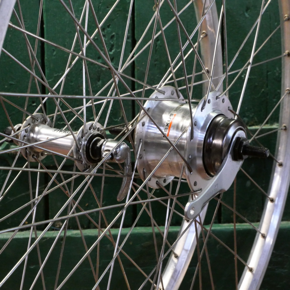Laufradsatz WEINMANN ZAG 19, 26 Zoll (559), Alu-Hohlkammerfelge für Drahtreifen, Breite ca. 24 mm, IDEAL-Nabe vorn Alu, für Schnellspanner, Nabe hinten SHIMANO Inter7 Nexus, frühe, hochwertige Alu-Ausführung (1990er J.), Einbaumaß ca. 100/128 mm, 2mm Speichen nirosta, alte Neuware mit leichten Lagerungsspuren, Zustand gemäß Fotos