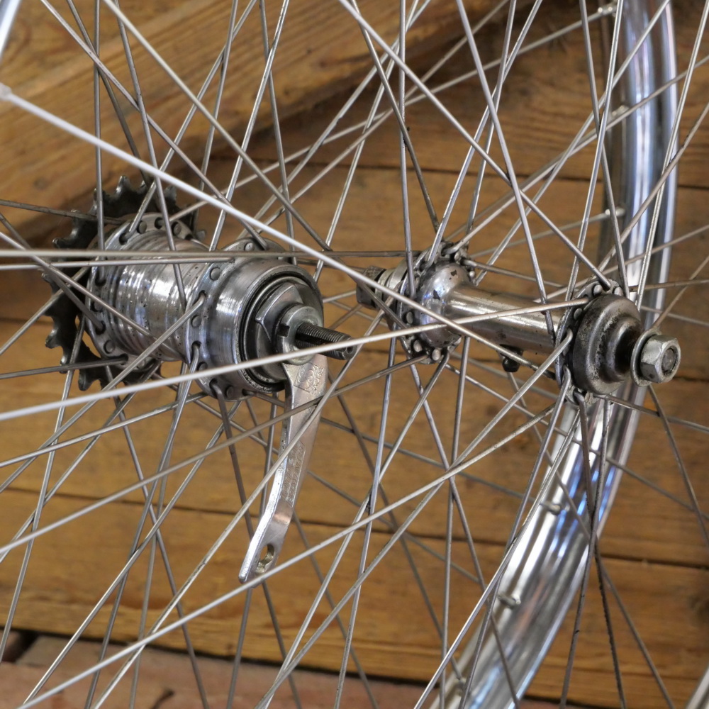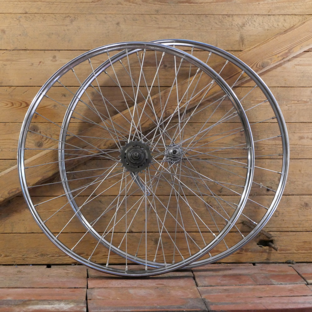 Laufradsatz mit Westwood-Felgen 26 Zoll (559), verchromt, 1970er/80er J., Breite 40 mm, Nabe vorn verchromt, Nabe hinten F&S Torpedo mit Steckritzel 20 Zähne, Einbaumaß ca. 102/108 mm, ED-Speichen rostfrei, gebraucht mit schöner Patina, Zustand gemäß Fotos