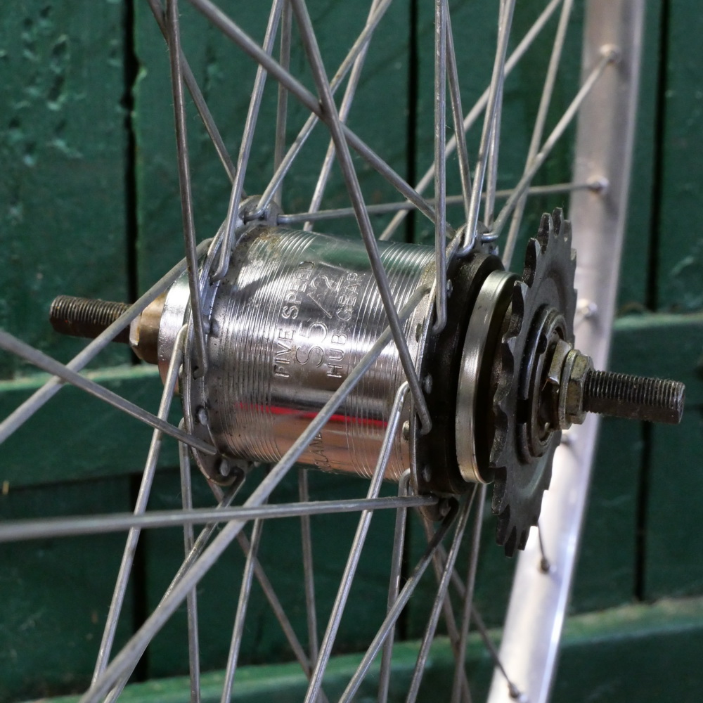 Hinterrad 28 Zoll (622), für Drahtbereifung, WEINMANN Alu-Felge, Bj. 1984, Breite ca. 23 mm, Einbaumaß ca. 115, Sturmey Archer five speed S5/2 ohne Rücktrittbremse mit Steckritzel 19 Zähne, Speichen 2,34 mm verzinkt, alte Neuware mit leichten Lagerungsspuren, Zustand gemäß Fotos