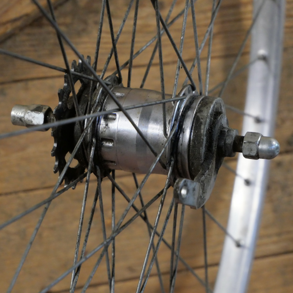 Hinterrad mit GRÜNERT-Felge, Alu, 28 Zoll (622), 80er/90er J., Breite ca. 25 mm, Nabe F&S 3-Gang Mod. S mit Steckritzel 20 Zähne, Einbaumaß ca. 108 mm, 36 Loch, 2 mm Speichen verzinkt, gebraucht mit Patina, Zustand gemäß Fotos