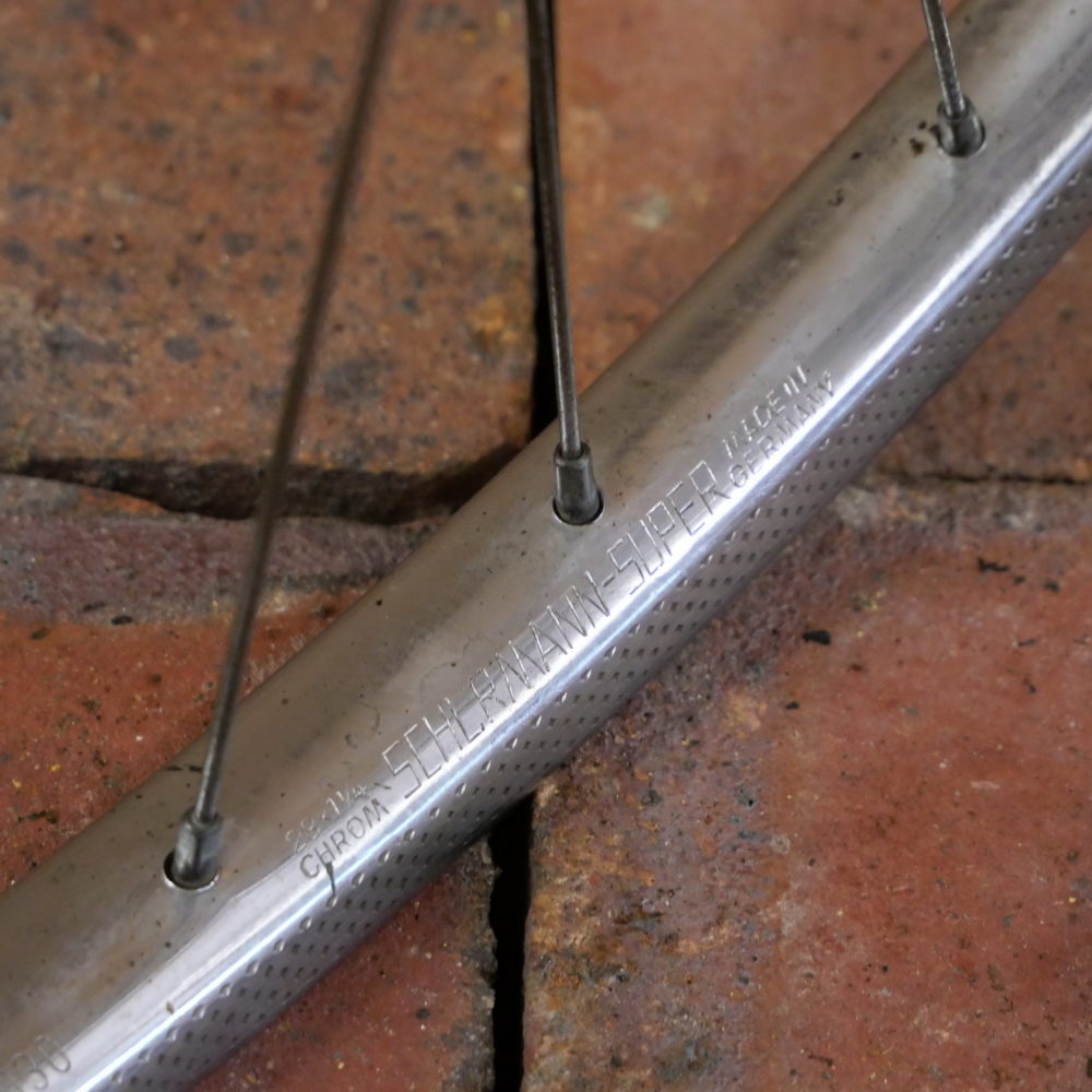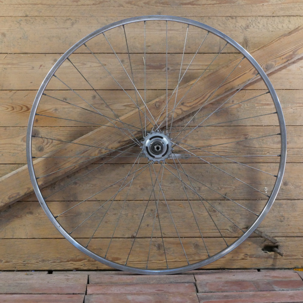 Hinterrad mit SCHÜRMANN-Felge 28 Zoll (622), verchromt, 1980er/90er J., Breite 24 mm, F&S Torpedo Dreigang-Nabe Mod. S mit Steckritzel 19 Zähne, Einbaumaß ca. 118 mm, 2mm Speichen verchromt, gebraucht mit Patina, Zustand gemäß Fotos